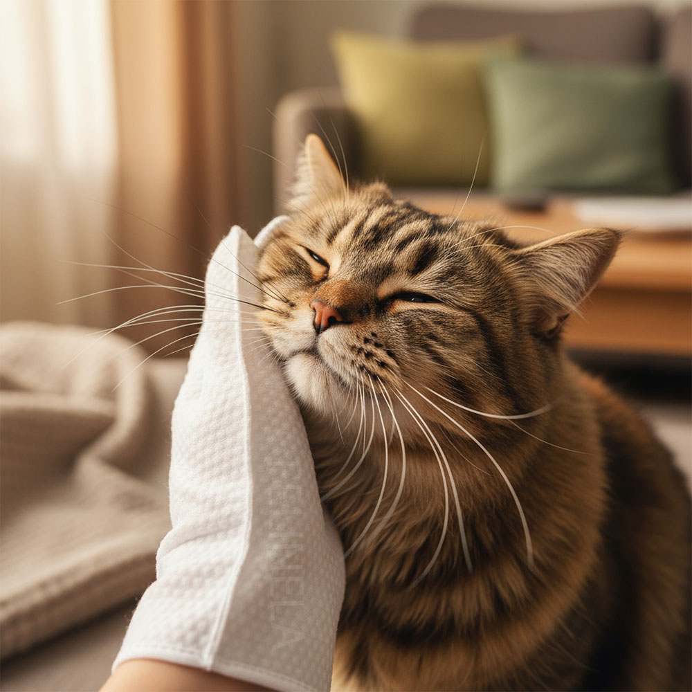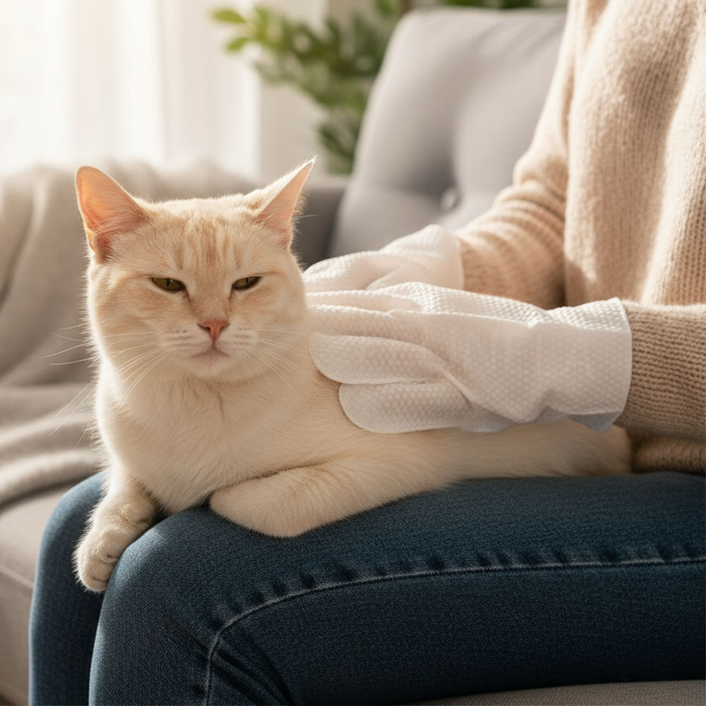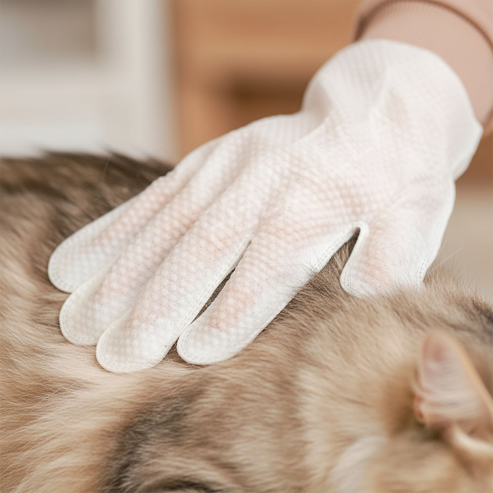 Čistiace rukavice pre mačky bez vody CatGlow – 6 ks sú praktickým riešením, keď chceš mačku rýchlo očistiť. Stačí si navliecť rukavicu napustenú esenciou a jemne pretrieť srsť, prach, peľ a nepríjemné pachy sa zachytia v priebehu pár minút. Pre mačku je to známy dotyk ruky, pre teba menej starostí s kúpaním. Jednoduchá každodenná starostlivosť bez zbytočného stresu.