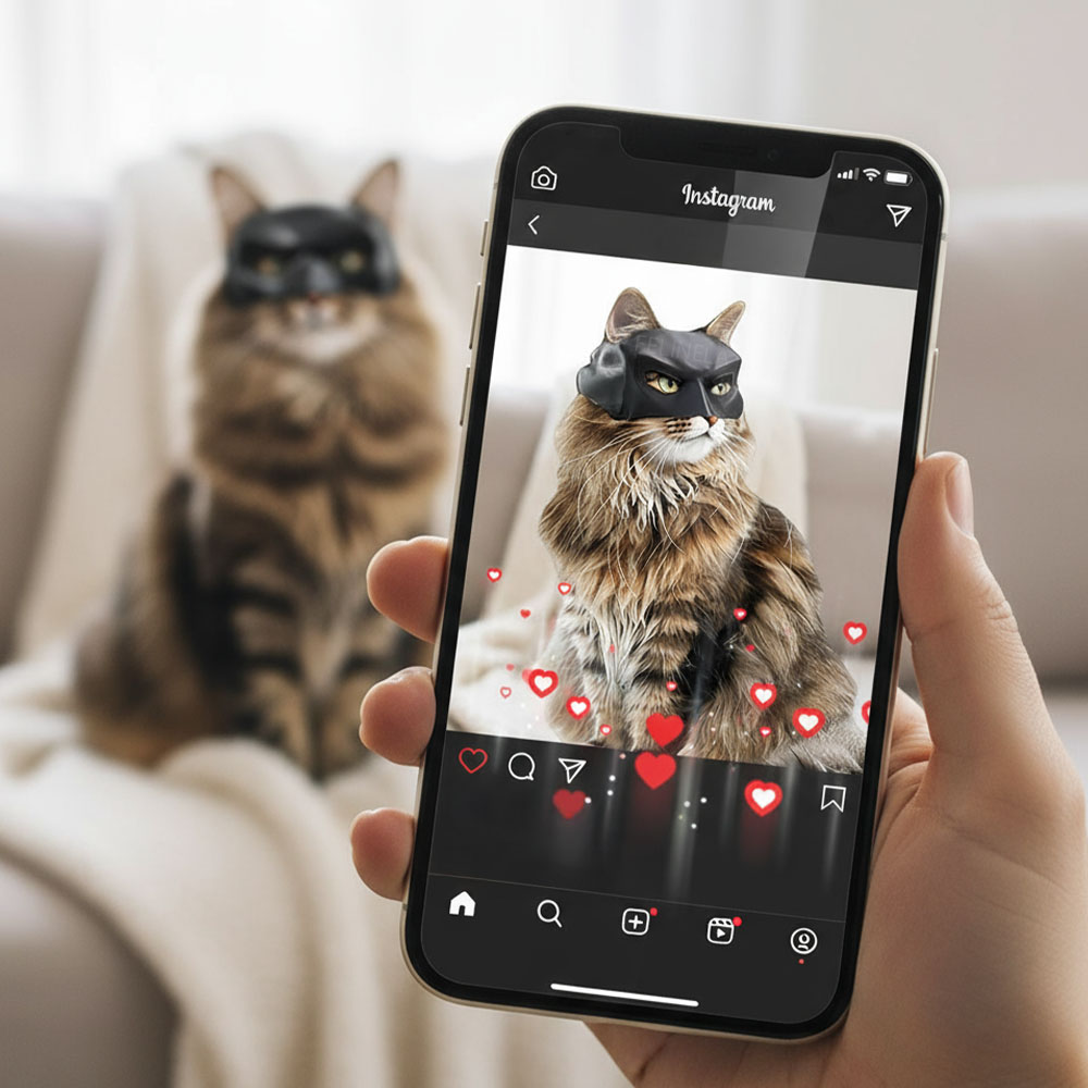 Každá mačkárka vie, že tie najlepšie fotky a videá sú tie, ktoré pôsobia prirodzene a zároveň vyvolajú reakcie. Vďaka tejto maske sa tvoj miláčik v okamihu zmení na hrdinu reelsov či TikTokov. Komentáre v štýle „kde si to zohnala?!“ prídu rýchlejšie, než stihneš kliknúť na srdiečko. Jednoduchý spôsob, ako nechať mačku zažiariť na sociálnych sieťach a zbierať lajky rýchlejšie než ty ich stíhaš počítať.